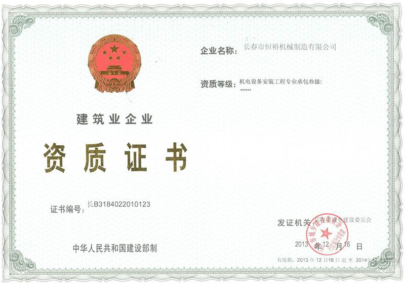 熱烈慶祝長春市恒裕機械制造有限公司2013年12月獲得國際焊接認證資質(zhì)證書和機電安裝資質(zhì)證書