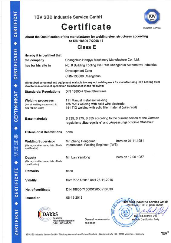 2013年12月我公司歷時半年時間,分別獲得了DIN18800-7國際焊接認證證書和機電安裝三級資質(zhì)證書,在一汽大眾公司的許多合作伙伴中,我們是率先獲取的這兩項資質(zhì)認證的,為我們今后與大眾合作打開了便利通道,獲得DIN18800-7國際焊接認證資質(zhì),使我們可以承接大的鋼結(jié)構(gòu),以及歐洲標準要求的焊接項目。